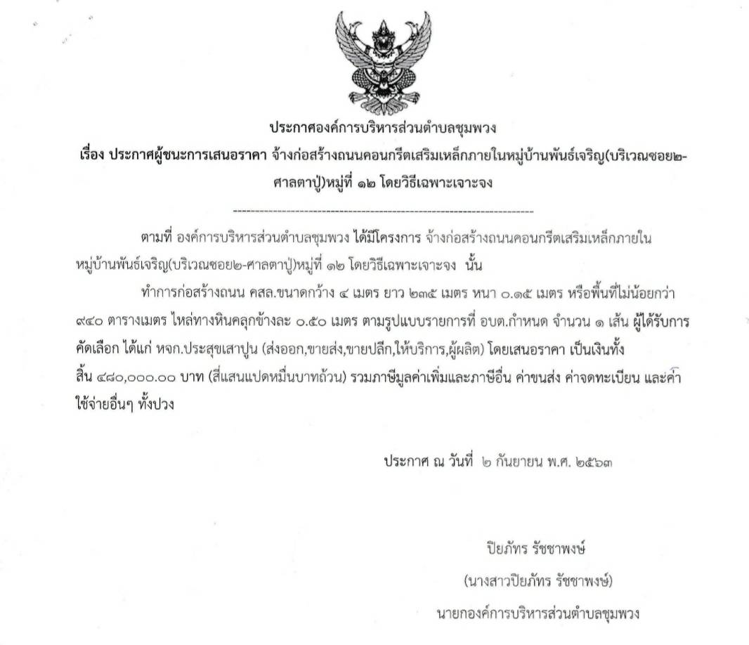 ประกาศราคาจ้างก่อสร้างถนนคอนกรีตเสริมเหล็กภายในบ้านพันธ์เจริญหมู่ที่12 (ซอย 4 - ไปบ้านหนองตะคลอง) |